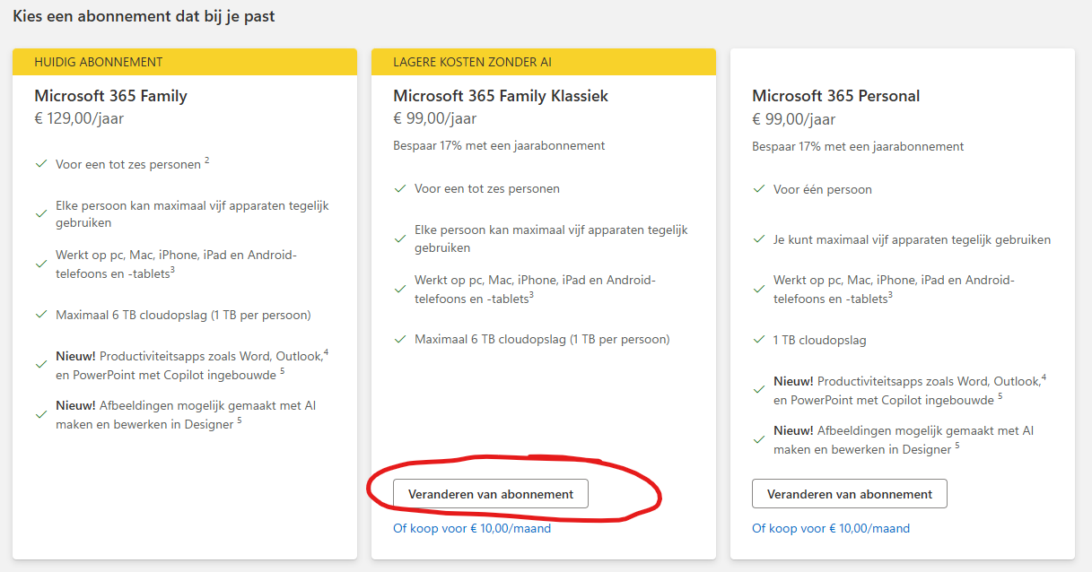 Maar als je net zoals ik wel het icoontje van Copilot hebt gezien, maar er niet de waarde van hebt ondervonden dan kunnen we goed zonder die AI van Microsoft. We gaan dan weer terug naar de €99,- per jaar.