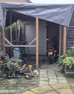 Helaas heb ik niet alles kunnen doen wat ik zou willen doen. Denk dat ik zo voor de helft klaar ben met het bouwen van het huisje voor de motor. Wat nu nog moet gebeuren zijn de wanden, het dak bedekken en de elektriciteit aanleggen. Voor de elektriciteit heb ik alles al. De (buiten) wanden kan ik misschien volgende week (week 45) ophalen. Aan de kant van de buurvrouw zet ik er damwandplaten tegenaan. Aan de kant van mijn tuin doe ik het zelfde als de deur e.d. Houten planken in de lengte. De binnenkant van de wanden wil ik ook bekleden met OSB platen en misschien het dak ook. Daar tussen kan dan iets van isolatie. Maar goed. De damwandplaten zullen dit jaar nog wel geplaatst worden. De rest is voor volgend jaar.